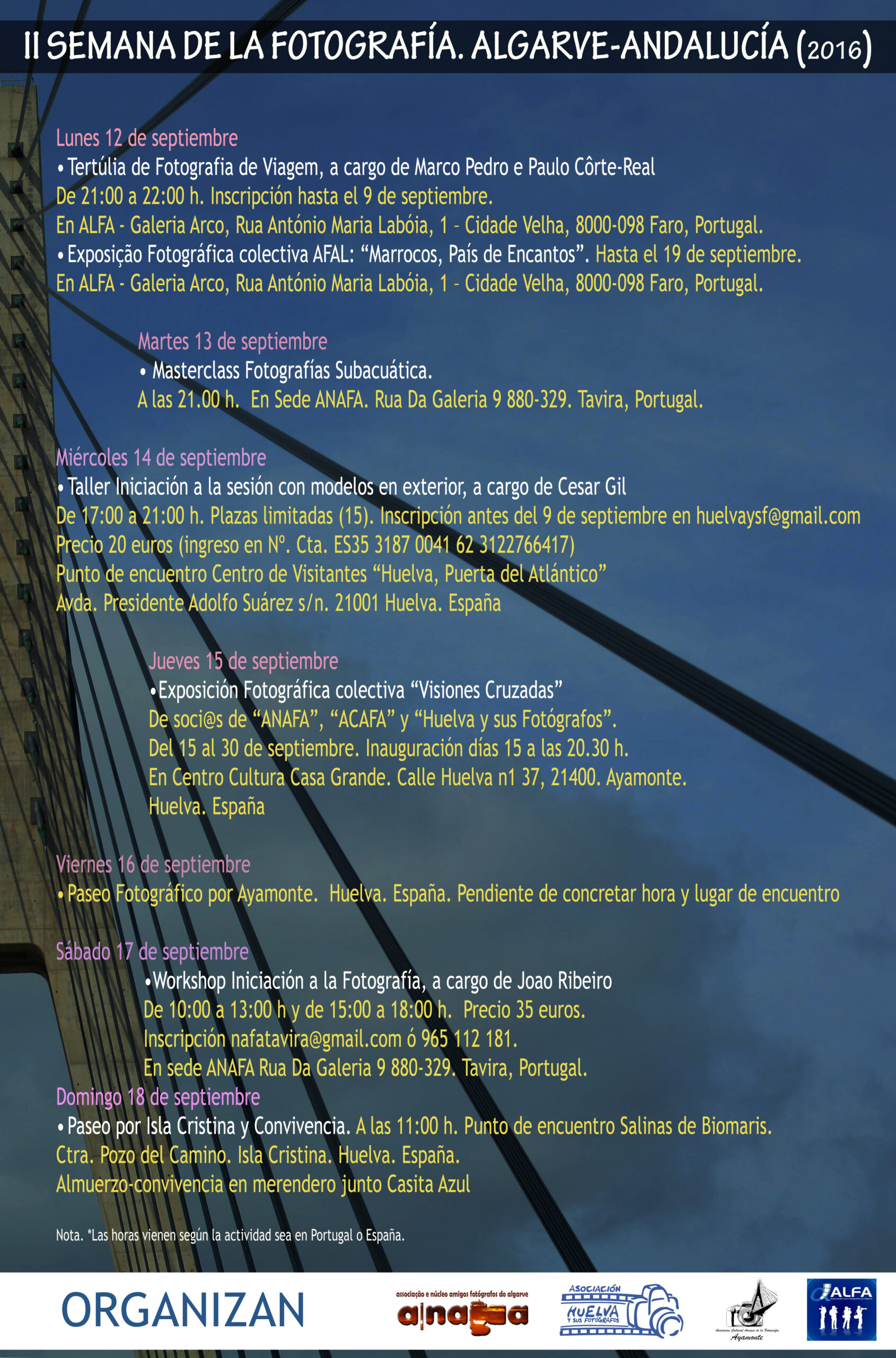Este año, 2016, el programa de la II SEMANA DE LA FOTOGRAFÍA se ha trasladado a septiembre (del 12 al 18) y reúne un abanico de eventos fotográficos muy diversos que han organizado conjuntamente entre la Associaçao e Núcleo de Amigos Fotógrafos do Algarve (A-NAFA), ACAFA-Ayamonte, Asociación Huelva y sus Fotógrafos, y ALFA-Faro. Exposiciones, Workshop (talleres y tertulias), paseos fotográficos, jornada de convivencia, todo un abanico de propuestas que seguro gustan a los apasionados de la fotografía, abiertas a la participación de aficionados, previa inscripción en aquellas que lo precisen.