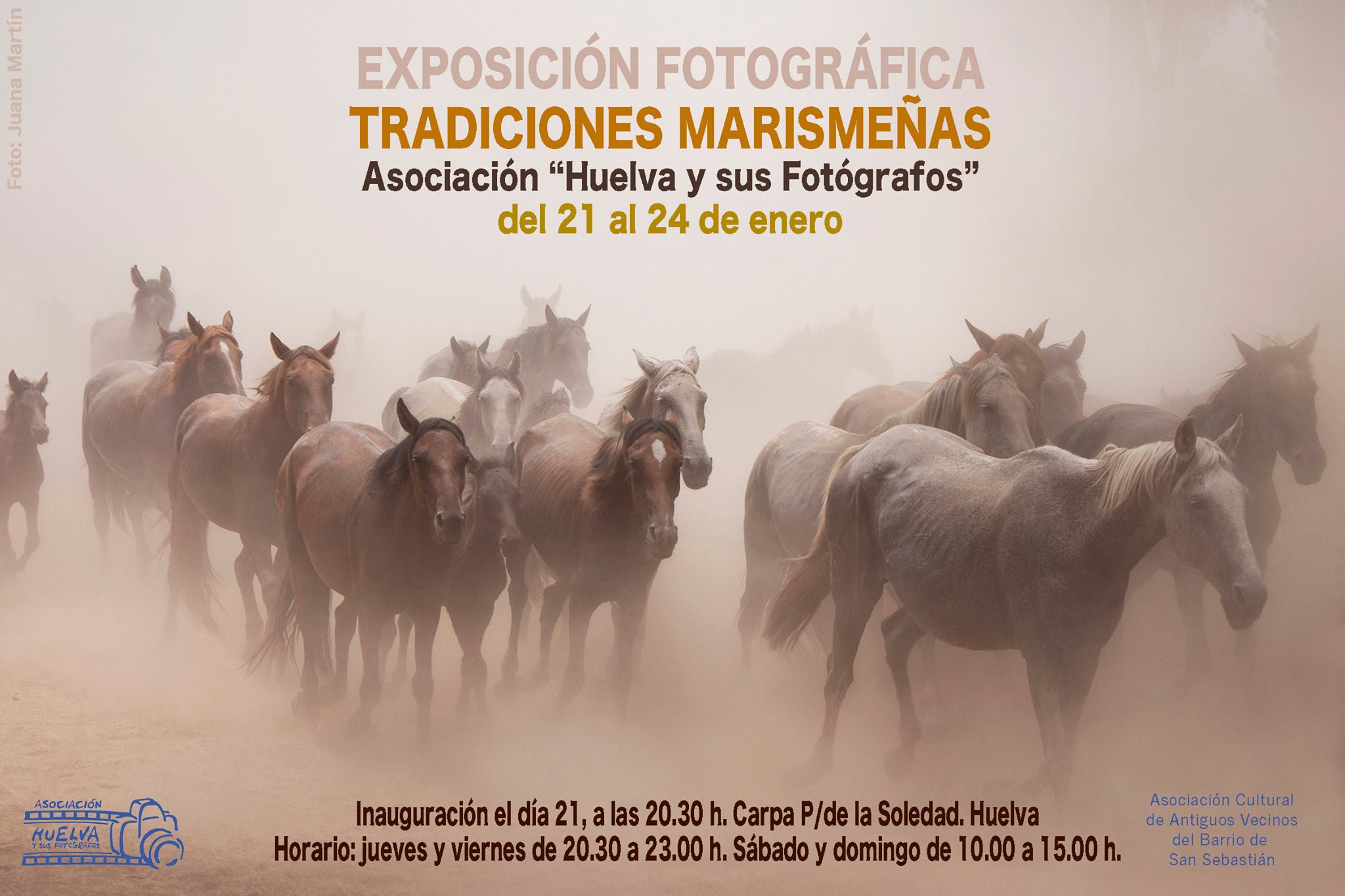 Iniciamos el año con una exposición… os esperamos en la Carpa para la inauguración…. La «Asociación Huelva y sus Fotógrafos» mostrará su exposición fotográfica titulada Tradiciones Marismeñas, en el marco del Programa de Actos de las Fiestas de San Sebastián 2016 en Huelva, concretamente en la Carpa situada en la Plaza de la Soledad, e invitados por la «Asociación de Antiguos Vecinos del Barrio de San Sebastián». La inauguración será este jueves 21 de enero,