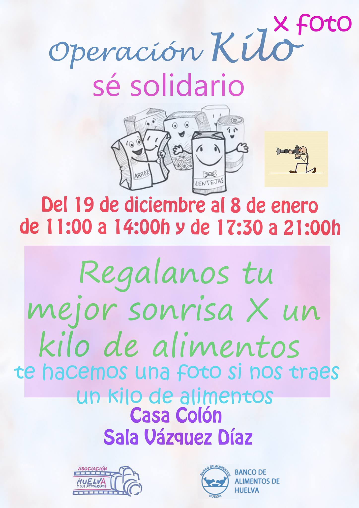 Quienes visiten nuestra exposición «7 PECADOS CAPITALES» en Casa Colón, puede colaborar con esta iniciativa solidaria. Desde el pasado 19 de diciembre, y hasta el 8 de enero de 11:00 a 14:00 h y de 17:30 a 21:00 h., estaremos en la Sala Vázquez Díaz de la Casa Colón, haciendo fotografías a cambio de alimentos. Es una de esas experiencia tipo «una foto por un kilo de alimento».Nuestra asociación donará todos los alimentos recogidos al Banco de Alimentos de Huelva, y hacemos un llamamiento a los ciudadanos onubenses para que se sumen a esta iniciativa.